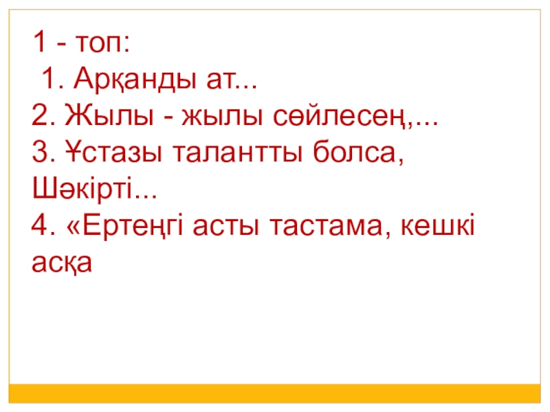 1 - топ: 1. Арқанды ат...  2. Жылы - жылы сөйлесең,...  3. Ұстазы талантты болса,