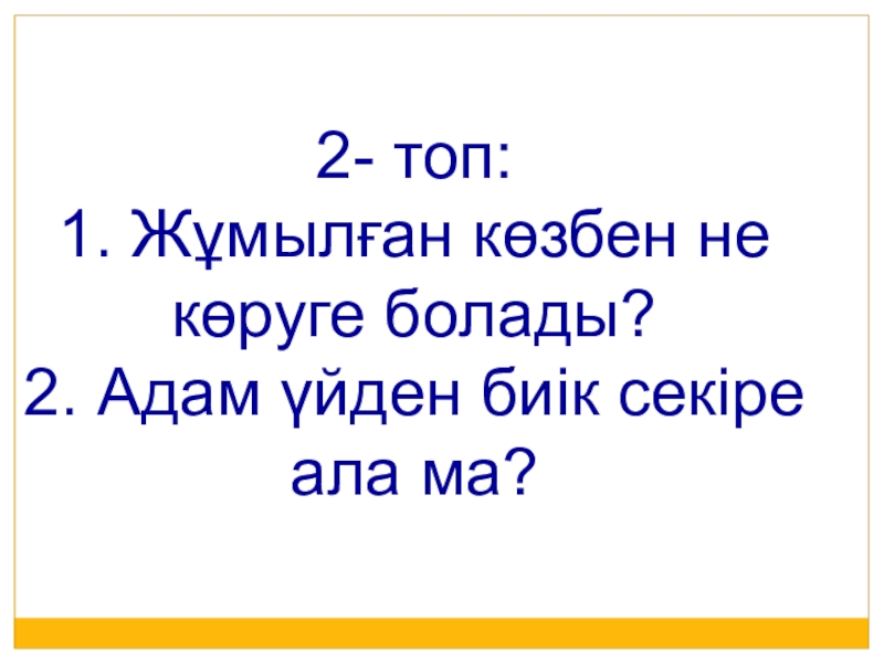 2- топ: 1. Жұмылған көзбен не көруге болады?  2. Адам үйден биік секіре ала ма?