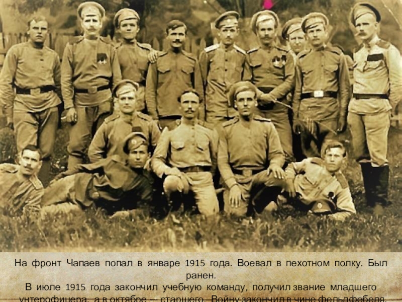 Слайд 9На  фронт  Чапаев  попал  в  январе  1915  года.  Воевал  в  пехотном