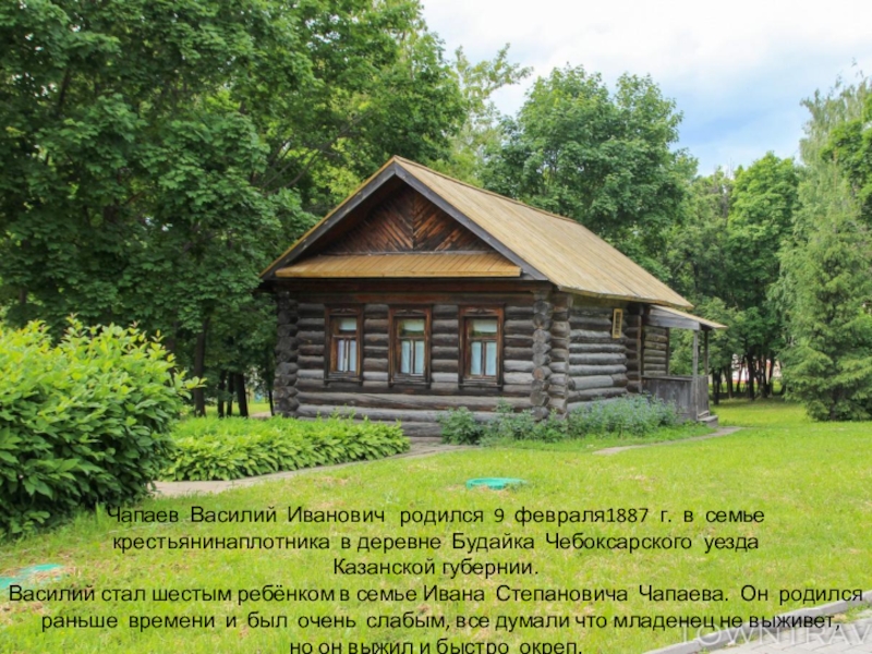 Чапаев  Василий  Иванович   родился  9  февраля1887  г.  в  семье  крестьянина­плотника  в деревне  Будайка  Чебоксарского  уезда  Казанской губернии. Василий стал шестым ребёнком в семье Ивана  Степановича  Чапаева.  Он  родился  раньше  времени  и  был  очень  слабым, все думали что младенец не выживет, но он выжил и быстро  окреп.