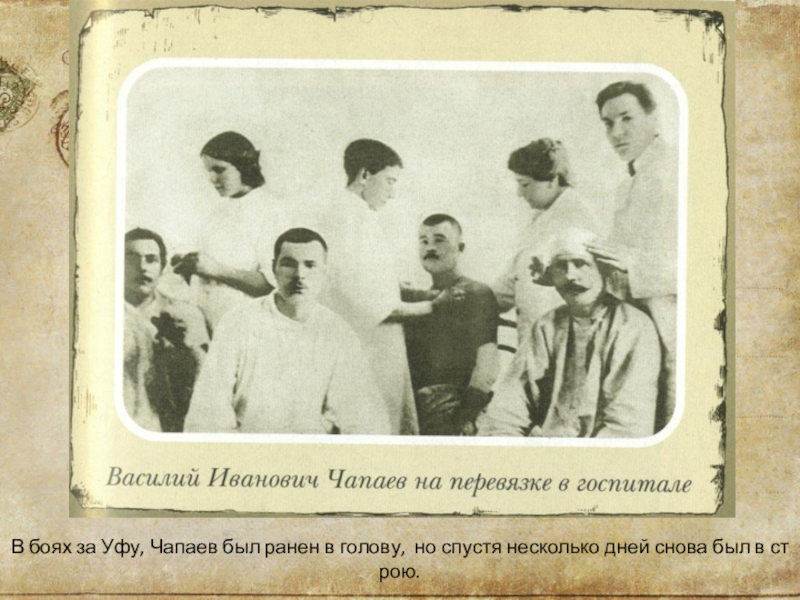Слайд 15В боях за Уфу, Чапаев был ранен в голову,  но спустя несколько дней снова был в строю.