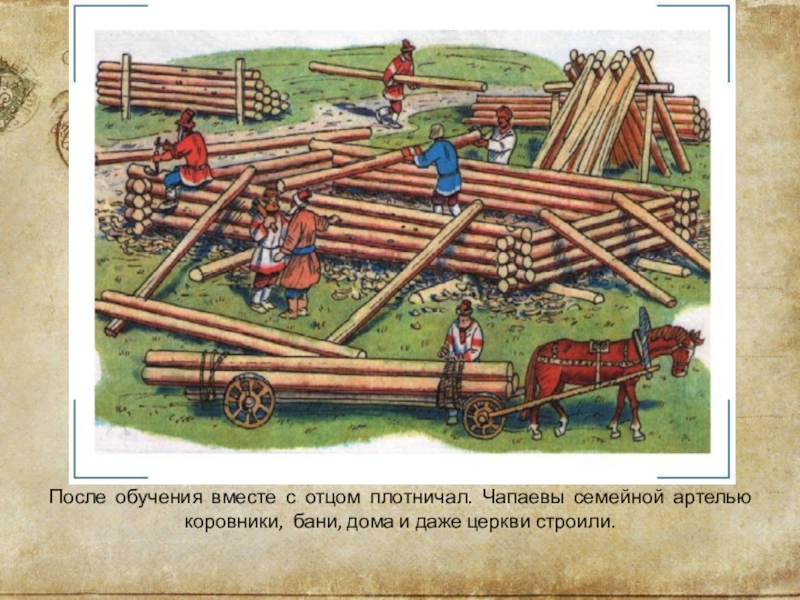Слайд 5После  обучения  вместе  с  отцом  плотничал.  Чапаевы  семейной  артелью