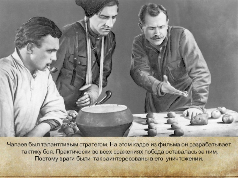 Слайд 17Чапаев был талантливым стратегом. На этом кадре из фильма он разрабатывает