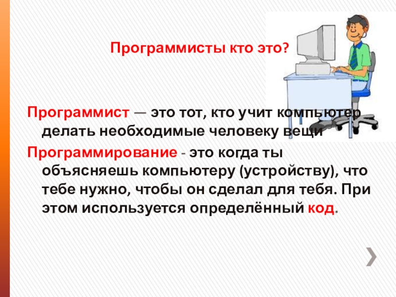 Программирование - это когда ты объясняешь компьютеру (устройству), что тебе нужно, чтобы он сделал для тебя. При этом используется определённый код.