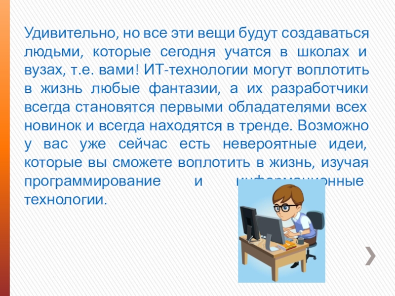в школах и вузах, т.е. вами! ИТ-технологии могут воплотить в жизнь любые фантазии, а их разработчики всегда становятся первыми обладателями всех новинок и всегда находятся в тренде. Возможно у вас уже сейчас есть невероятные идеи, которые вы сможете воплотить в жизнь, изучая программирование и информационные технологии.