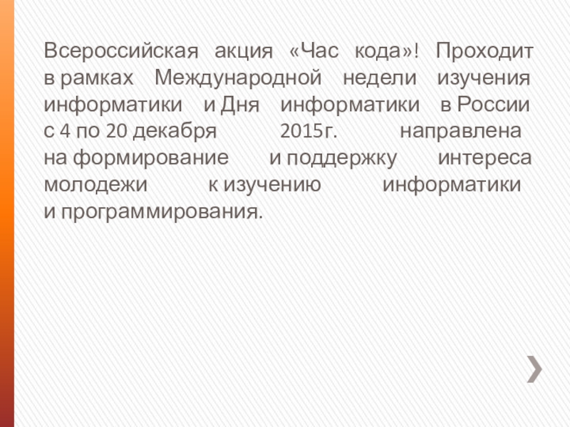 Слайд 2Всероссийская акция «Час кода»! Проходит в рамках Международной недели изучения информатики и Дня