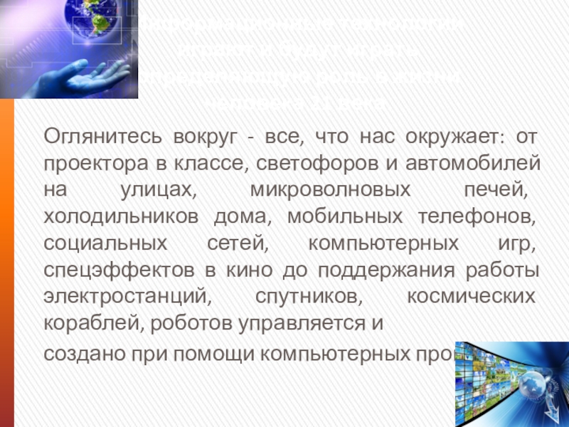 - все, что нас окружает: от проектора в классе, светофоров и автомобилей на улицах, микроволновых печей, холодильников дома, мобильных телефонов, социальных сетей, компьютерных игр, спецэффектов в кино до поддержания работы электростанций, спутников, космических кораблей, роботов управляется и