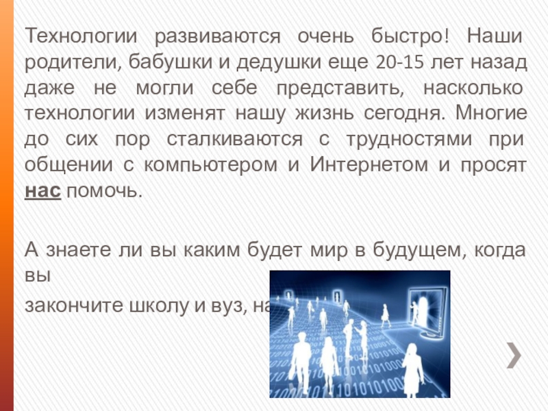 Слайд 5Технологии развиваются очень быстро! Наши родители, бабушки и дедушки еще 20-15