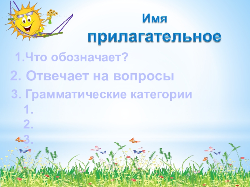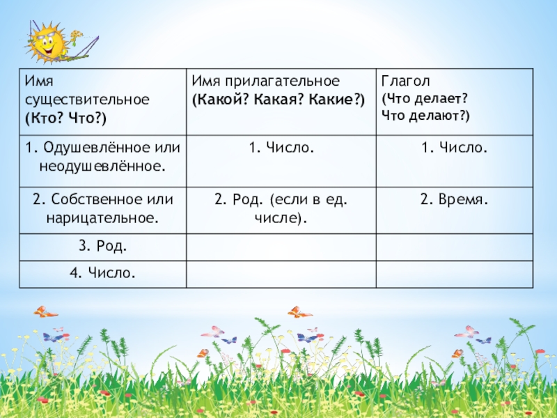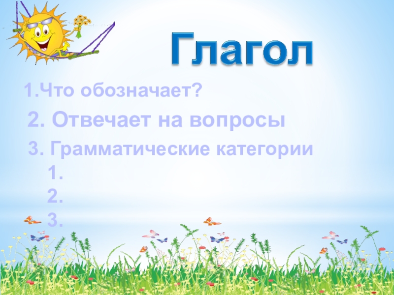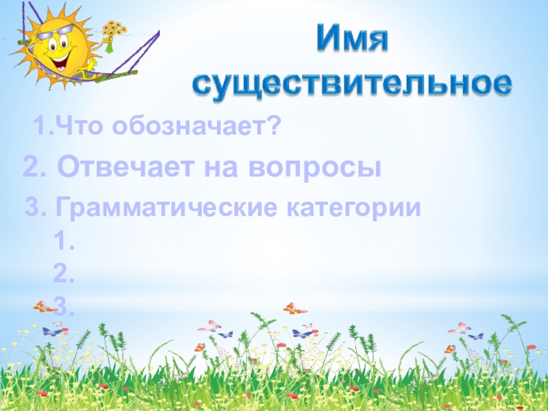 1.Что обозначает?2. Отвечает на вопросы3. Грамматические категории  1.  2.  3.