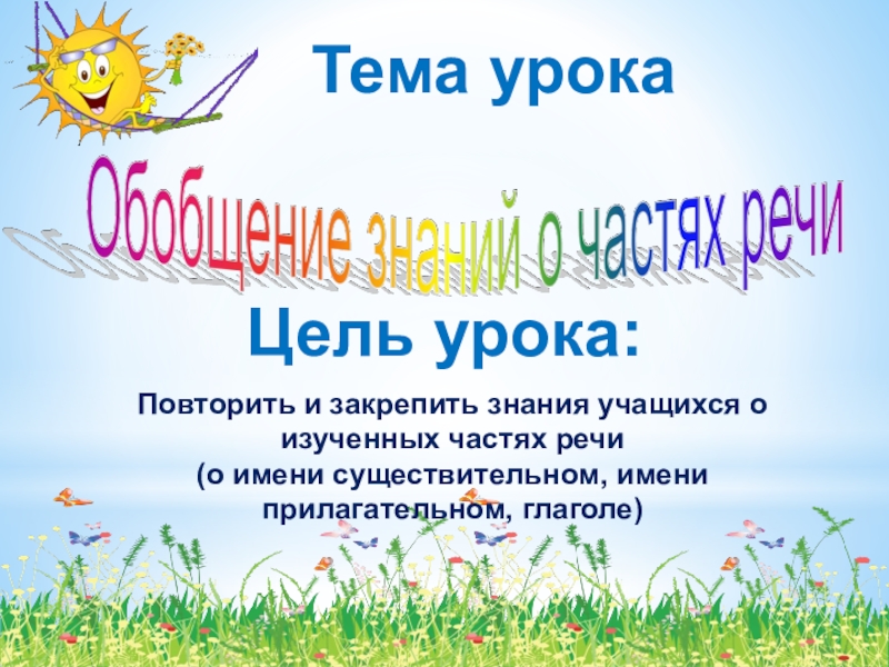 Тема урокаЦель урока:Повторить и закрепить знания учащихся о изученных частях речи (о имени существительном, имени прилагательном, глаголе)