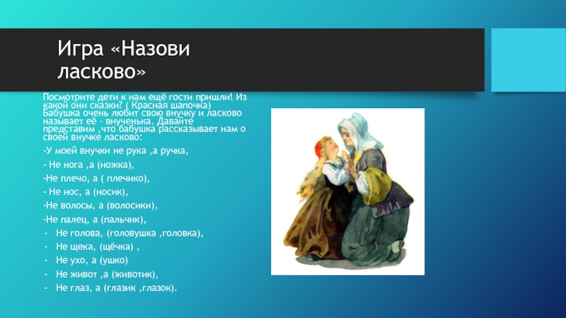 они сказки? ( Красная шапочка) Бабушка очень любит свою внучку и ласково называет её – внученька. Давайте представим ,что бабушка рассказывает нам о своей внучке ласково:
