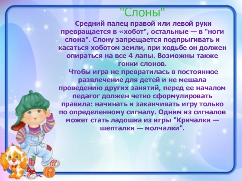 Чтобы игра не превратилась в постоянное развлечение для детей и не мешала проведению других занятий, перед ее началом педагог должен четко сформулировать правила: начинать и заканчивать игру только по определенному сигналу. Одним из сигналов может стать ладошка из игры "Кричалки — шепталки — молчалки".