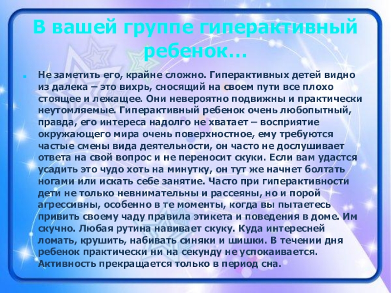 видно из далека – это вихрь, сносящий на своем пути все плохо стоящее и лежащее. Они невероятно подвижны и практически неутомляемые. Гиперактивный ребенок очень любопытный, правда, его интереса надолго не хватает – восприятие окружающего мира очень поверхностное, ему требуются частые смены вида деятельности, он часто не дослушивает ответа на свой вопрос и не переносит скуки. Если вам удастся усадить это чудо хоть на минутку, он тут же начнет болтать ногами или искать себе занятие. Часто при гиперактивности дети не только невнимательны и рассеяны, но и порой агрессивны, особенно в те моменты, когда вы пытаетесь привить своему чаду правила этикета и поведения в доме. Им скучно. Любая рутина навивает скуку. Куда интересней ломать, крушить, набивать синяки и шишки. В течении дня ребенок практически ни на секунду не успокаивается. Активность прекращается только в период сна.