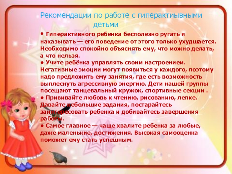 Слайд 30Шпаргалка по работе с гиперактивными детьми