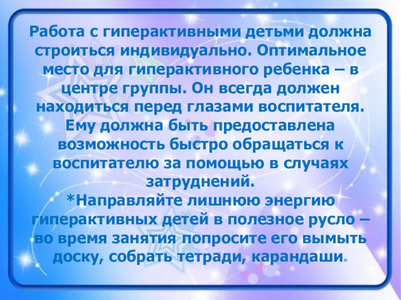 Слайд 3Работа с гиперактивными детьми должна строиться индивидуально. Оптимальное место для гиперактивного