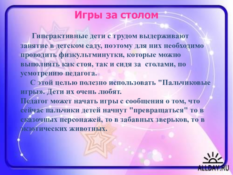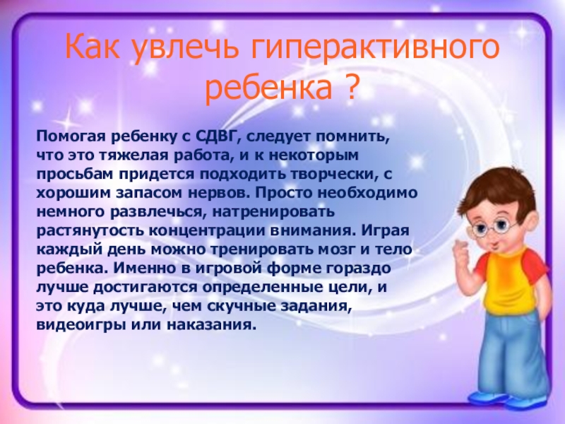 Слайд 4Как увлечь гиперактивного ребенка ?