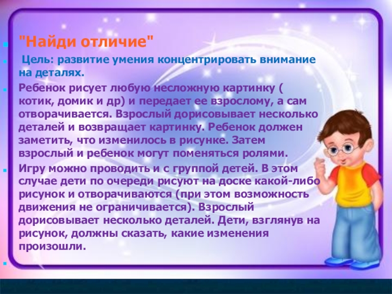 ( котик, домик и др) и передает ее взрослому, а сам отворачивается. Взрослый дорисовывает несколько деталей и возвращает картинку. Ребенок должен заметить, что изменилось в рисунке. Затем взрослый и ребенок могут поменяться ролями.