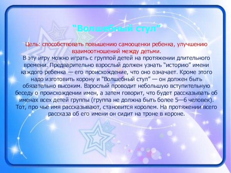 В эту игру можно играть с группой детей на протяжении длительного времени. Предварительно взрослый должен узнать “историю” имени каждого ребенка — его происхождение, что оно означает. Кроме этого надо изготовить корону и “Волшебный стул” — он должен быть обязательно высоким. Взрослый проводит небольшую вступительную беседу о происхождении имен, а затем говорит, что будет рассказывать об именах всех детей группы (группа не должна быть более 5—6 человек). Тот, про чье имя рассказывают, становится королем. На протяжении всего рассказа об его имени он сидит на троне в короне.