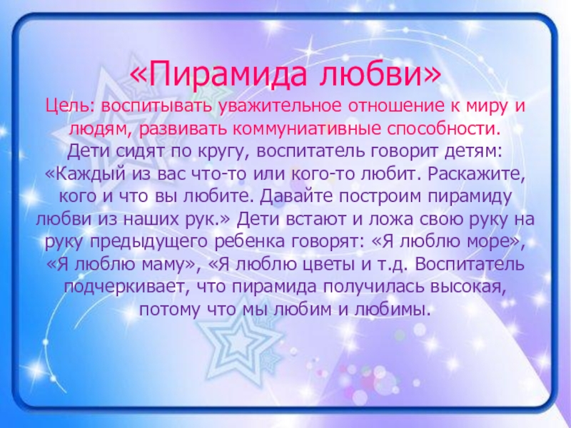 Дети сидят по кругу, воспитатель говорит детям: «Каждый из вас что-то или кого-то любит. Раскажите, кого и что вы любите. Давайте построим пирамиду любви из наших рук.» Дети встают и ложа свою руку на руку предыдущего ребенка говорят: «Я люблю море», «Я люблю маму», «Я люблю цветы и т.д. Воспитатель подчеркивает, что пирамида получилась высокая, потому что мы любим и любимы.