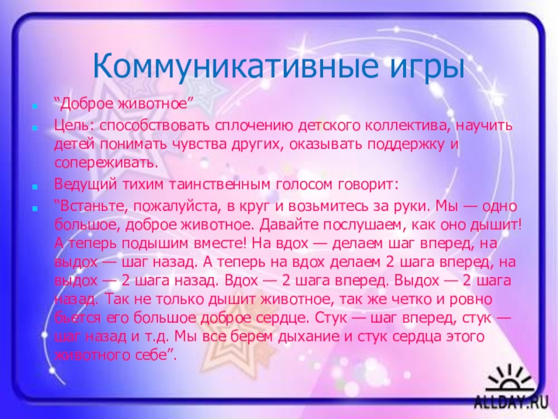 Цель: способствовать сплочению детского коллектива, научить детей понимать