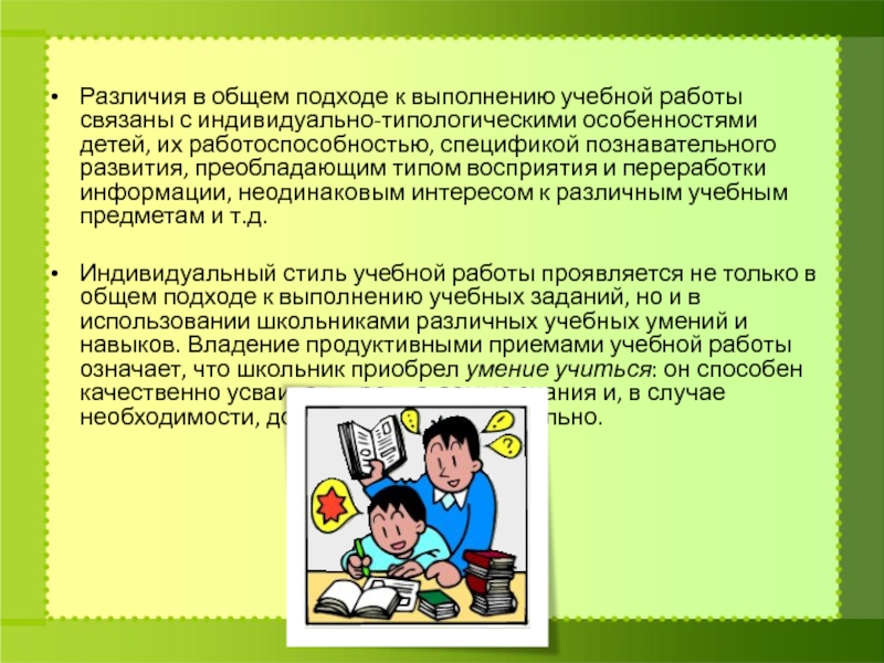Индивидуальный стиль учебной работы проявляется не только в общем подходе к выполнению учебных заданий, но и в использовании школьниками различных учебных умений и навыков. Владение продуктивными приемами учебной работы означает, что школьник приобрел умение учиться: он способен качественно усваивать предлагаемые знания и, в случае необходимости, добывать их самостоятельно.