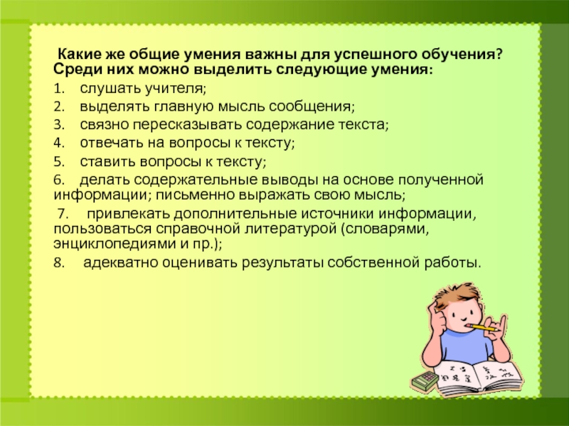 Его необходимо учить работать с учебным текстом: учить выделять главную мысль; составлять план текста; запоминать содержание текста и пересказывать его с опорой на план и т.д.
