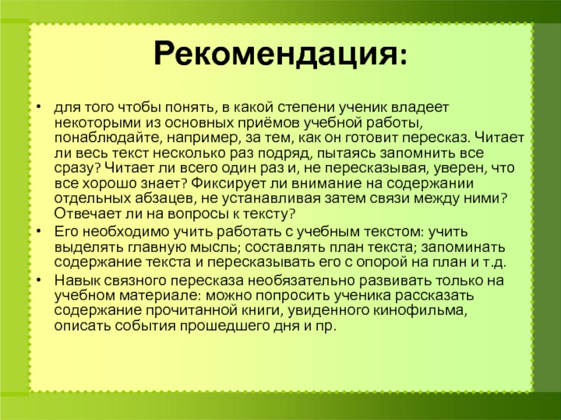 основных приёмов учебной работы, понаблюдайте, например, за тем, как он готовит пересказ. Читает ли весь текст несколько раз подряд, пытаясь запомнить все сразу? Читает ли всего один раз и, не пересказывая, уверен, что все хорошо знает? Фиксирует ли внимание на содержании отдельных абзацев, не устанавливая затем связи между ними? Отвечает ли на вопросы к тексту?