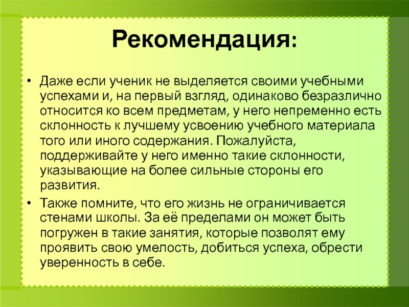 взгляд, одинаково безразлично относится ко всем предметам, у него непременно есть склонность к лучшему усвоению учебного материала того или иного содержания. Пожалуйста, поддерживайте у него именно такие склонности, указывающие на более сильные стороны его развития.