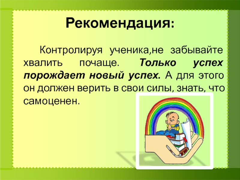 Контролируя ученика,не забывайте хвалить почаще. Только успех порождает новый
