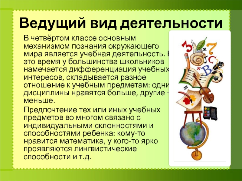 окружающего мира является учебная деятельность. В это время у большинства школьников намечается дифференциация учебных интересов, складывается разное отношение к учебным предметам: одни дисциплины нравятся больше, другие – меньше.