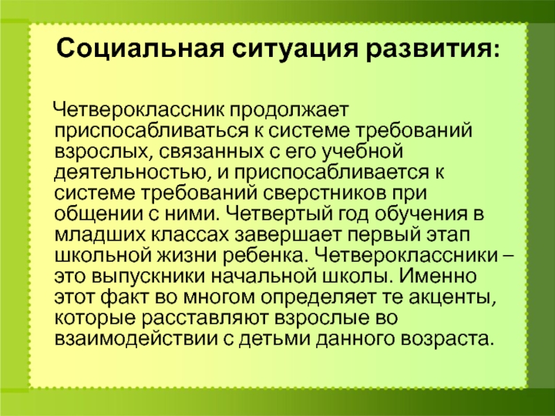 связанных с его учебной деятельностью, и приспосабливается к системе требований сверстников при общении с ними. Четвертый год обучения в младших классах завершает первый этап школьной жизни ребенка. Четвероклассники – это выпускники начальной школы. Именно этот факт во многом определяет те акценты, которые расставляют взрослые во взаимодействии с детьми данного возраста.