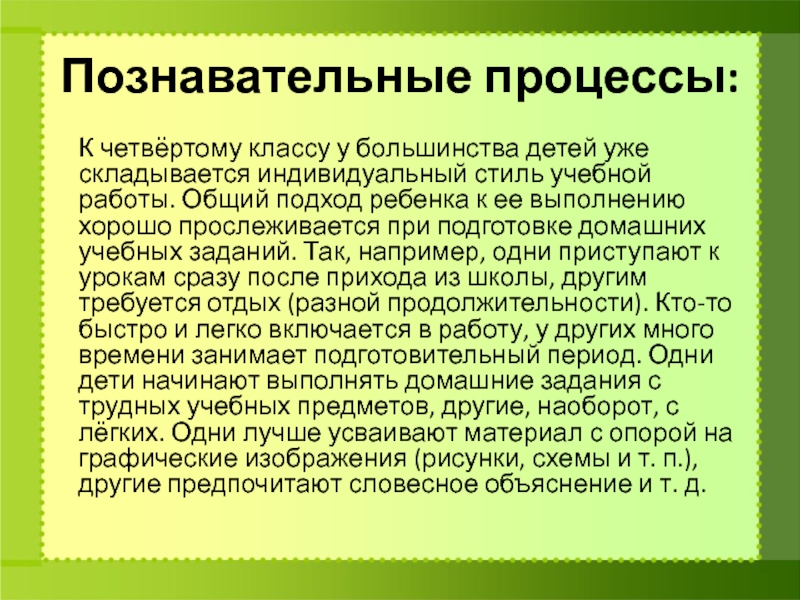 учебной работы. Общий подход ребенка к ее выполнению хорошо прослеживается при подготовке домашних учебных заданий. Так, например, одни приступают к урокам сразу после прихода из школы, другим требуется отдых (разной продолжительности). Кто-то быстро и легко включается в работу, у других много времени занимает подготовительный период. Одни дети начинают выполнять домашние задания с трудных учебных предметов, другие, наоборот, с лёгких. Одни лучше усваивают материал с опорой на графические изображения (рисунки, схемы и т. п.), другие предпочитают словесное объяснение и т. д.