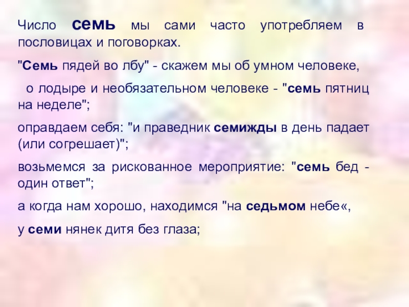 Слайд 5Число семь мы сами часто употребляем в пословицах и поговорках.