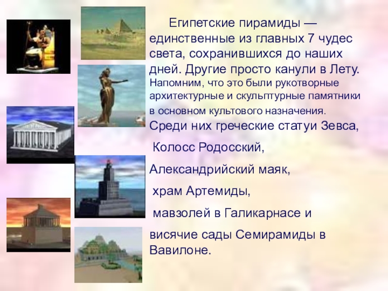 наших дней. Другие просто канули в Лету. Напомним, что это были рукотворные архитектурные и скульптурные памятники в основном культового назначения. Среди них греческие статуи Зевса,
