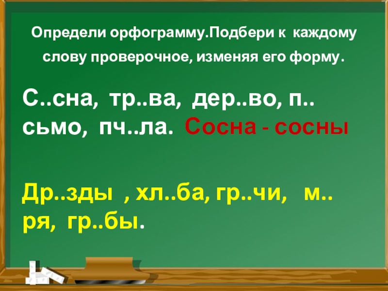 Определи орфограмму.Подбери к каждому слову проверочное, изменяя его форму.С..сна, тр..ва, дер..во, п..сьмо, пч..ла. Сосна - сосныДр..зды ,