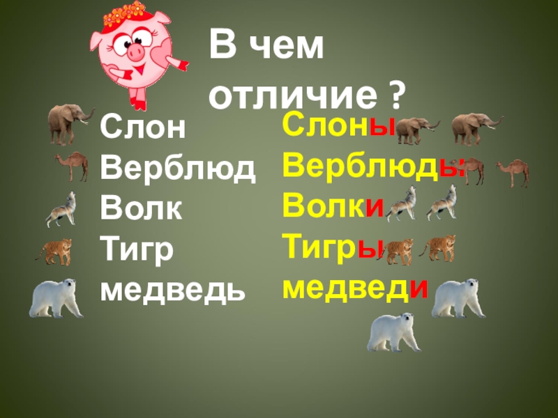 СлонВерблюдВолкТигрмедведьСлоныВерблюдыВолкиТигрымедведиВ чем отличие ?