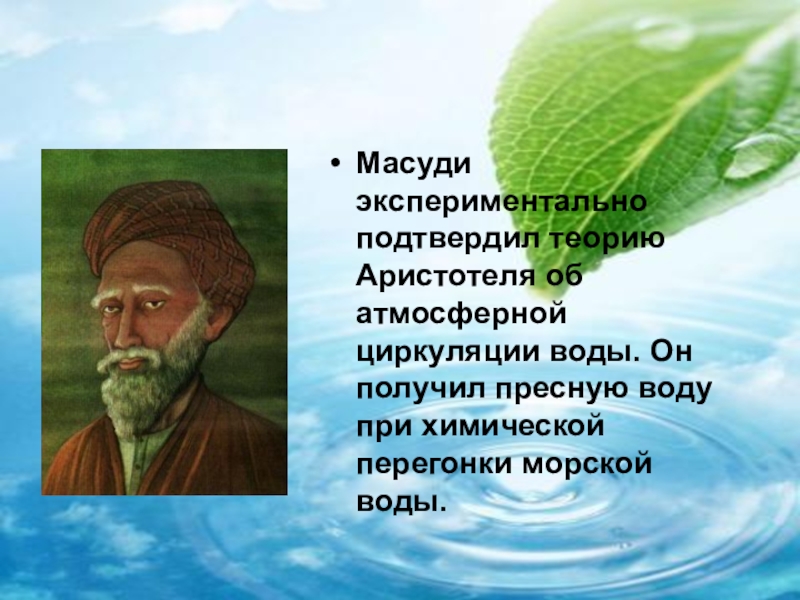 Слайд 10Масуди экспериментально подтвердил теорию Аристотеля об атмосферной циркуляции воды. Он получил