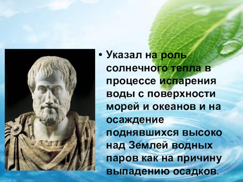 Слайд 9Указал на роль солнечного тепла в процессе испарения воды с поверхности