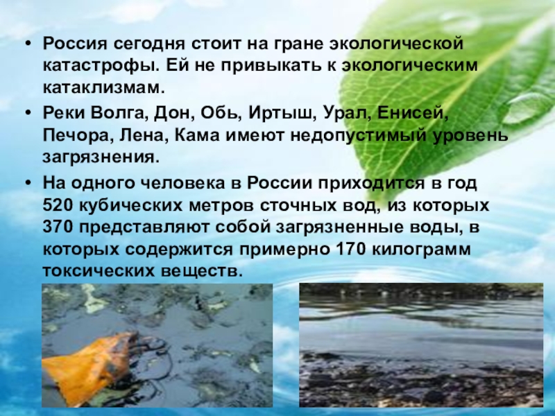 На одного человека в России приходится в год 520 кубических метров сточных вод, из которых 370 представляют собой загрязненные воды, в которых содержится примерно 170 килограмм токсических веществ.