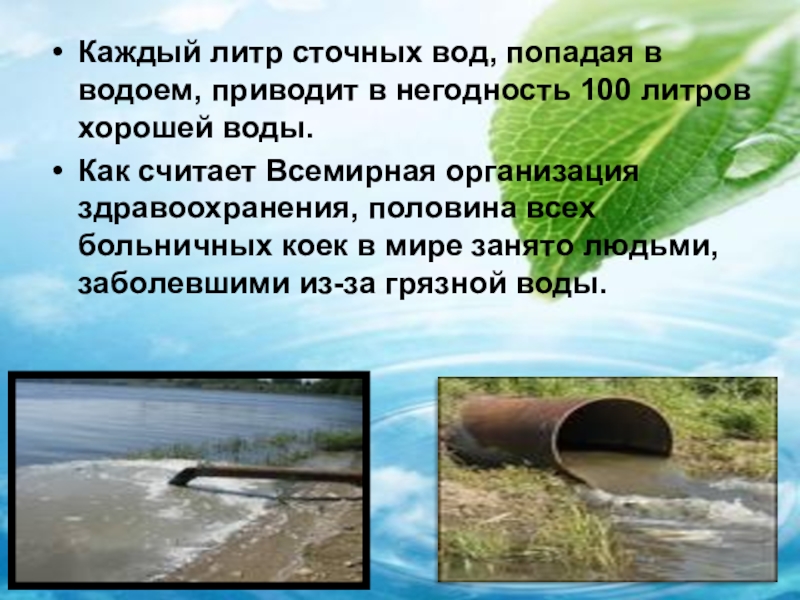 Слайд 14Каждый литр сточных вод, попадая в водоем, приводит в негодность 100