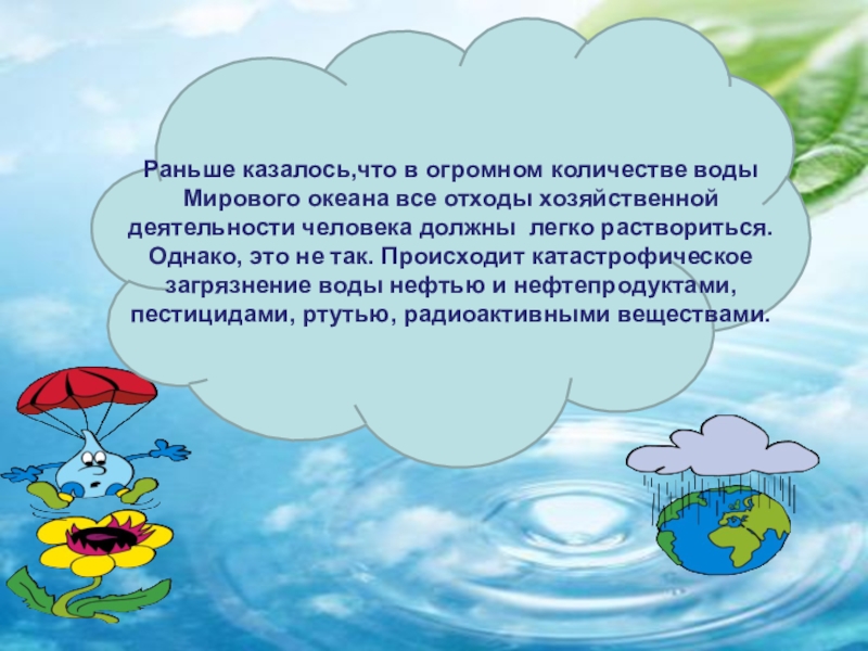 деятельности человека должны легко раствориться. Однако, это не так. Происходит катастрофическое загрязнение воды нефтью и нефтепродуктами, пестицидами, ртутью, радиоактивными веществами.