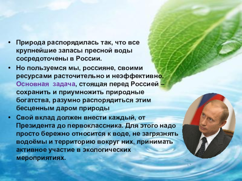 Свой вклад должен внести каждый, от Президента до первоклассника. Для этого надо просто бережно относится к воде, не загрязнять водоёмы и территорию вокруг них, принимать активное участие в экологических мероприятиях.