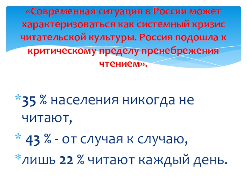 «Современная ситуация в России может характеризоваться как системный кризис читательской культуры. Россия подошла к критическому пределу пренебрежения чтением».
