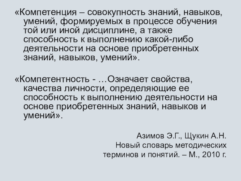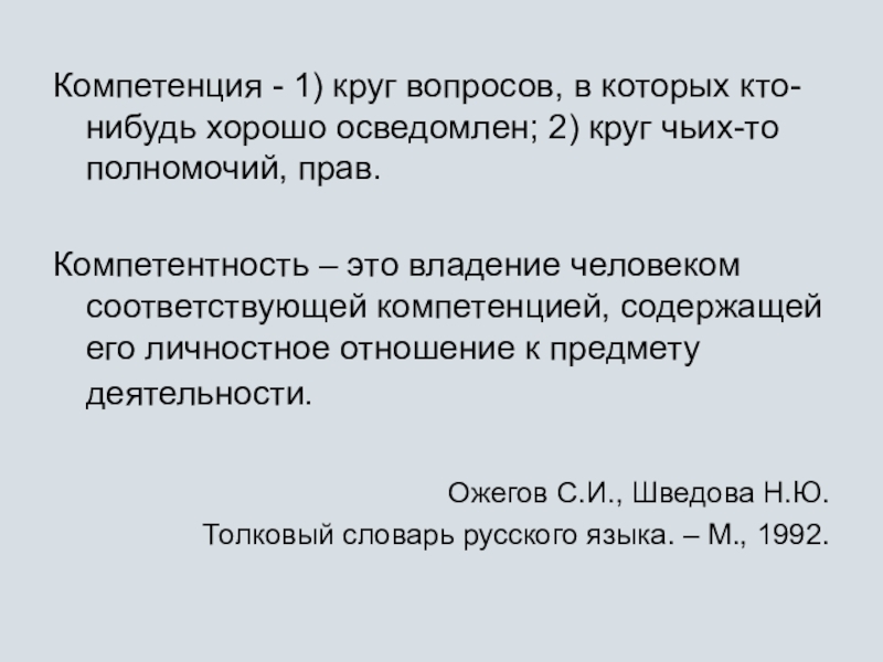 «Компетентность - …Означает свойства, качества личности, определяющие ее способность к выполнению деятельности на основе приобретенных знаний, навыков и умений».