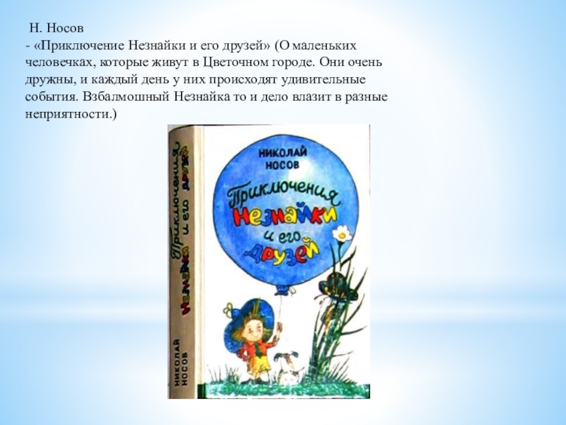 которые живут в Цветочном городе. Они очень дружны, и каждый день у них происходят удивительные события. Взбалмошный Незнайка то и дело влазит в разные неприятности.)