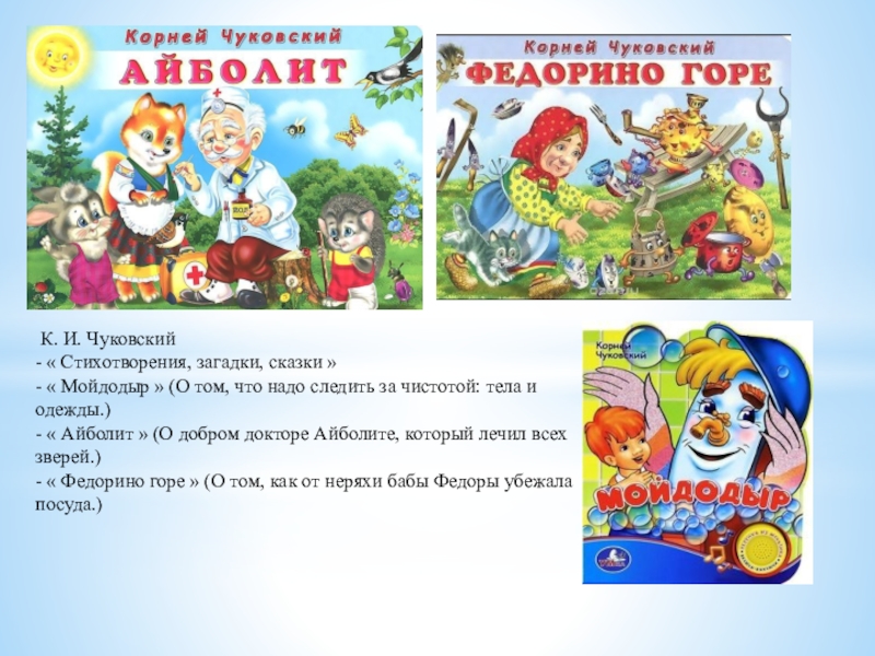 - « Айболит » (О добром докторе Айболите, который лечил всех зверей.)