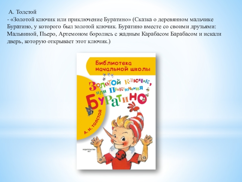мальчике Буратино, у которого был золотой ключик. Буратино вместе со своими друзьями: Мальвиной, Пьеро, Артемоном боролись с жадным Карабасом Барабасом и искали дверь, которую открывает этот ключик.)