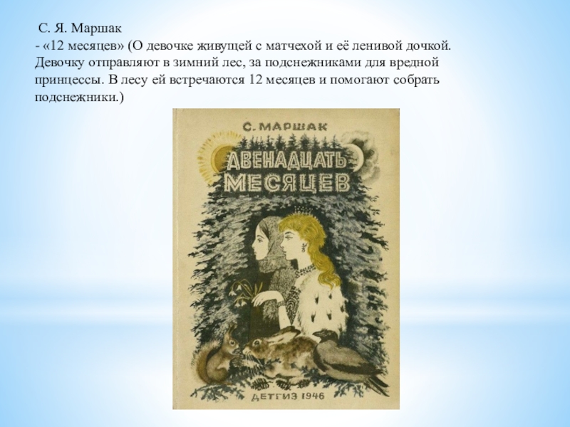 и её ленивой дочкой. Девочку отправляют в зимний лес, за подснежниками для вредной принцессы. В лесу ей встречаются 12 месяцев и помогают собрать подснежники.)