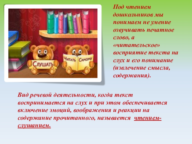 Вид речевой деятельности, когда текст воспринимается на слух и при этом обеспечивается включение эмоций, воображения и реакции на содержание прочитанного, называется чтением-слушанием.