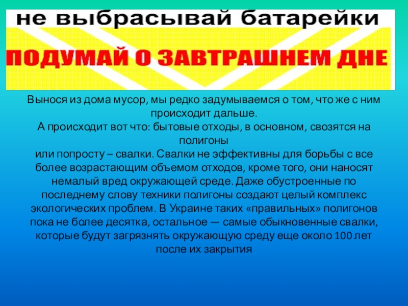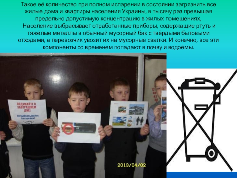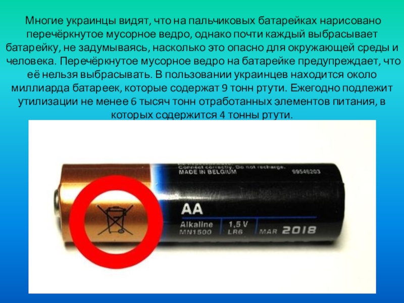ведро, однако почти каждый выбрасывает батарейку, не задумываясь, насколько это опасно для окружающей среды и человека. Перечёркнутое мусорное ведро на батарейке предупреждает, что её нельзя выбрасывать. В пользовании украинцев находится около миллиарда батареек, которые содержат 9 тонн ртути. Ежегодно подлежит утилизации не менее 6 тысяч тонн отработанных элементов питания, в которых содержится 4 тонны ртути.